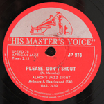 ![]() | ![]() | ALMON'S JAZZ EIGHT Please, Don't Shout / Please, Go Back led by Almon Memela 78 rpm, made in South Africa | 1965c issued: 1965c | 0AS 2450 0AS 2451 | JP 978 His Master's Voice EMI | |