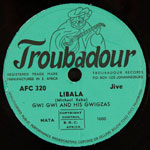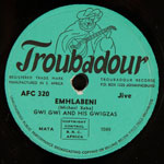 |  | GWI GWI AND HIS GWIGZAS Emhlabeni / Libala Gwigwi Mrwebi, Michael Xaba, Gray Mbau 78 rpm, made in South Africa | 1955 issued: 1955 | MATA 1599 MATA 1600 | AFC 320 Troubadour Troubadour |