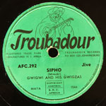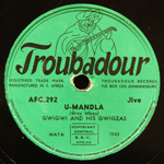 |  | GWI GWI AND HIS GWIGZAS U-Mandla / Sipho With Gwigwi Mrwebi 78 rpm, made in South Africa | 1955 issued: 1955 | MATA 1543 MATA 1544 | AFC 292 Troubadour Troubadour |