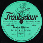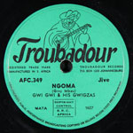 |  | GWI GWI AND HIS GWIGZAS Ngoma / Bomba Special With Gwigwi Mrwebi 78 rpm, made in South Africa | 1955c issued: 1955c | MATA 1627 MATA 1628 | AFC 349 Troubadour Troubadour |