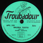 |  | MABEL MAFUYA Baleka Tsotsi / Ilifalam 78 rpm, made in South Africa | 1955 issued: 1955c | MATA 1655 MATA 1656 | AFC 339 Troubadour Troubadour |