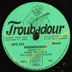 |  | MABEL MAFUYA AND THE CAPE EARTHQUAKES Ngenesokeni / Emgodini reviewed by Todd Matshikiza in Drum 1956 78 rpm, made in South Africa | 1956 issued: 1956 | MATA 1673 MATA 1674 | AFC 353 Troubadour Troubadour |