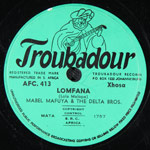 |  | MABEL MAFUYA AND THE DELTA BROTHERS Lomfana / Mau Mau 78 rpm, made in South Africa | 1957 issued: 1957 | MATA 1757 MATA 1758 | AFC 413 Troubadour Troubadour |