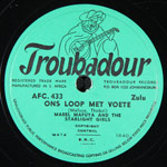 ![]() | ![]() | MABEL MAFUYA AND THE STARLIGHT GIRLS News on Record / Ons Loop Met Voete recorded after the bus boycott of January 7th, 1957 78 rpm, made in South Africa | 1957 issued: 1957 | MATA 1839 MATA 1840 | AFC 433 Troubadour Troubadour | |